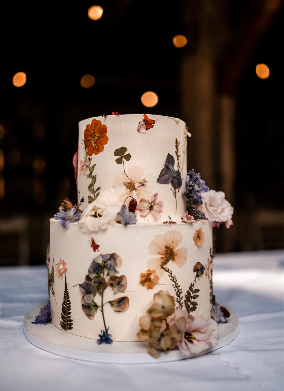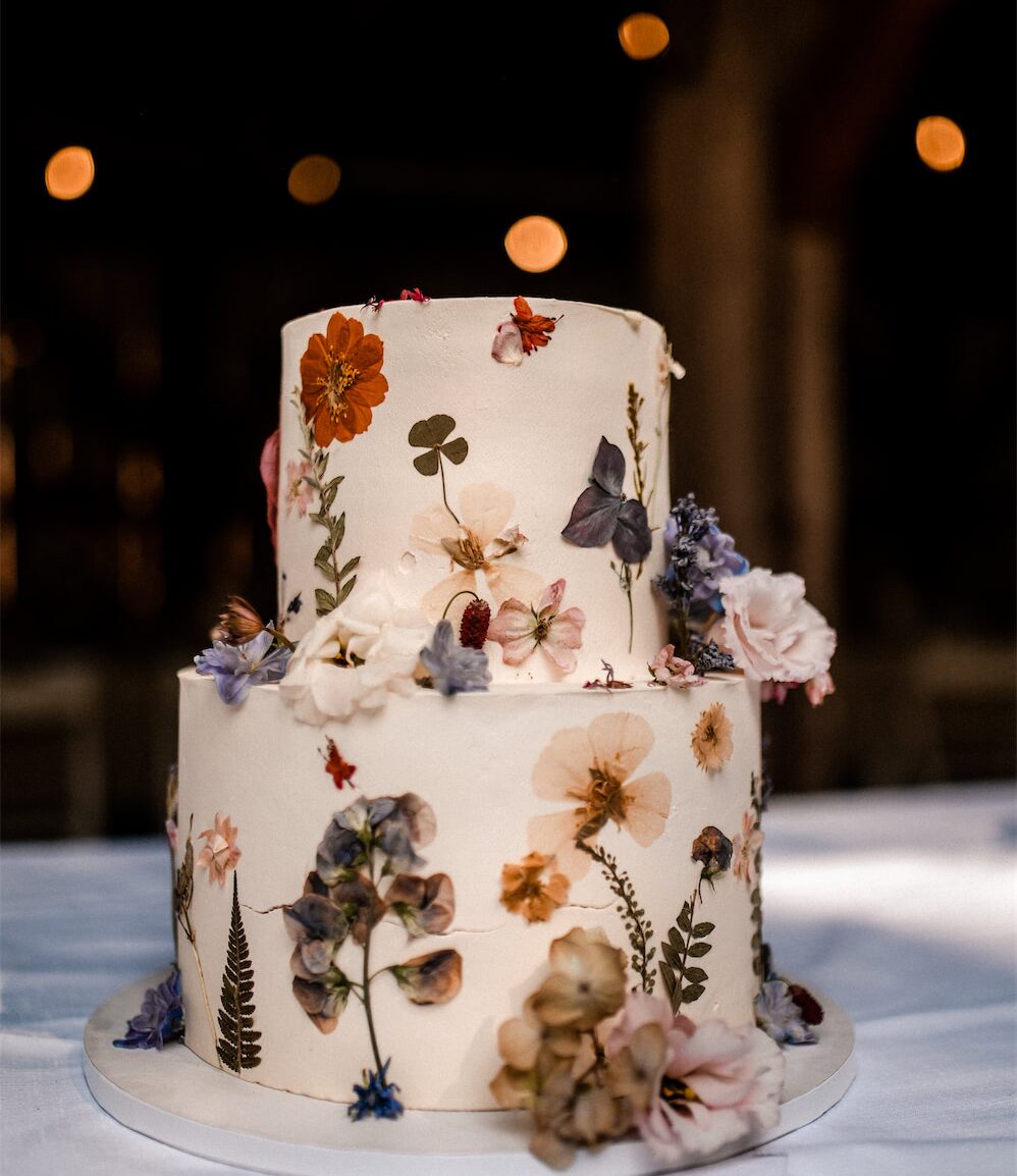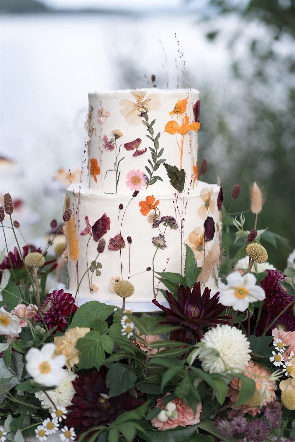 Of course, this requires weeks of preparation and I grow all the edible field and meadow flowers in my garden myself, harvest them carefully and then press them carefully so that they keep their shape and color. I am happy to supplement these with edible grasses or Mediterranean herbs. The flowers grow along the cake like in a meadow, or for a less floral look, I selectively place individual flowers and leaves directly on the cream dress of the cake, which can be in a cream tone, but also in any other pastel color.